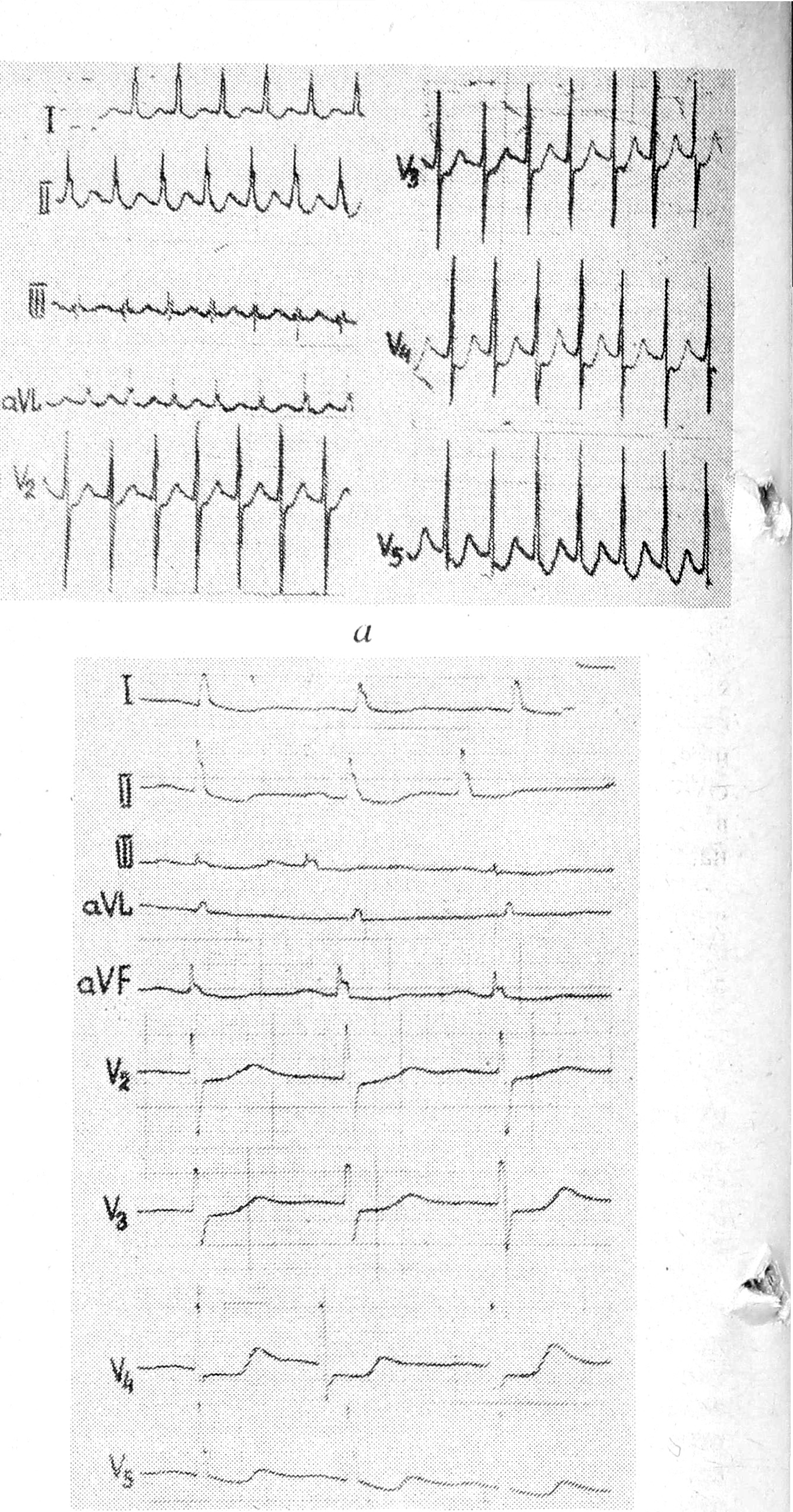 28.10.1987 г. в 15 ч 30 мин была госпитализирована в терапевтическое отделение. Состояние при поступлении тяжелое: больная заторможена, на вопросы отвечает с трудом, обращает на себя внимание выраженный акроцианоз. Частота дыхания — 28 в мин, положение вынужденное — сидя. В легких перкуторный звук с коробочным оттенком, справа ниже угла лопатки — притупление перкуторного звука. Дыхание над поверхностью легких ослабленное, справа по всем полям прослушиваются влажные среднепузырчатые хрипы, слева — влажные хрипы в подключичной области. Тоны сердца ритмичные, глухие. Пульс — 200 уд. в 1 мин, ритмичный, АД — 23,9/13,3 кПа. Живот мягкий, безболезненный. Печень и селезенка не увеличены. Отеков нет. На ЭКГ (рис. 1 а) — суправентрикулярная тахикардия с частотой 200 в мин, с депрессией сегмента СТ в отведениях V4—6.