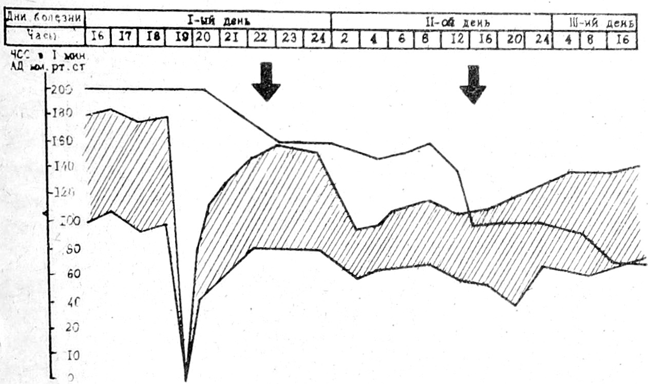 Рис. 2. Динамика пульса и АД больной В., 88 лет, в первые три дня болезни.