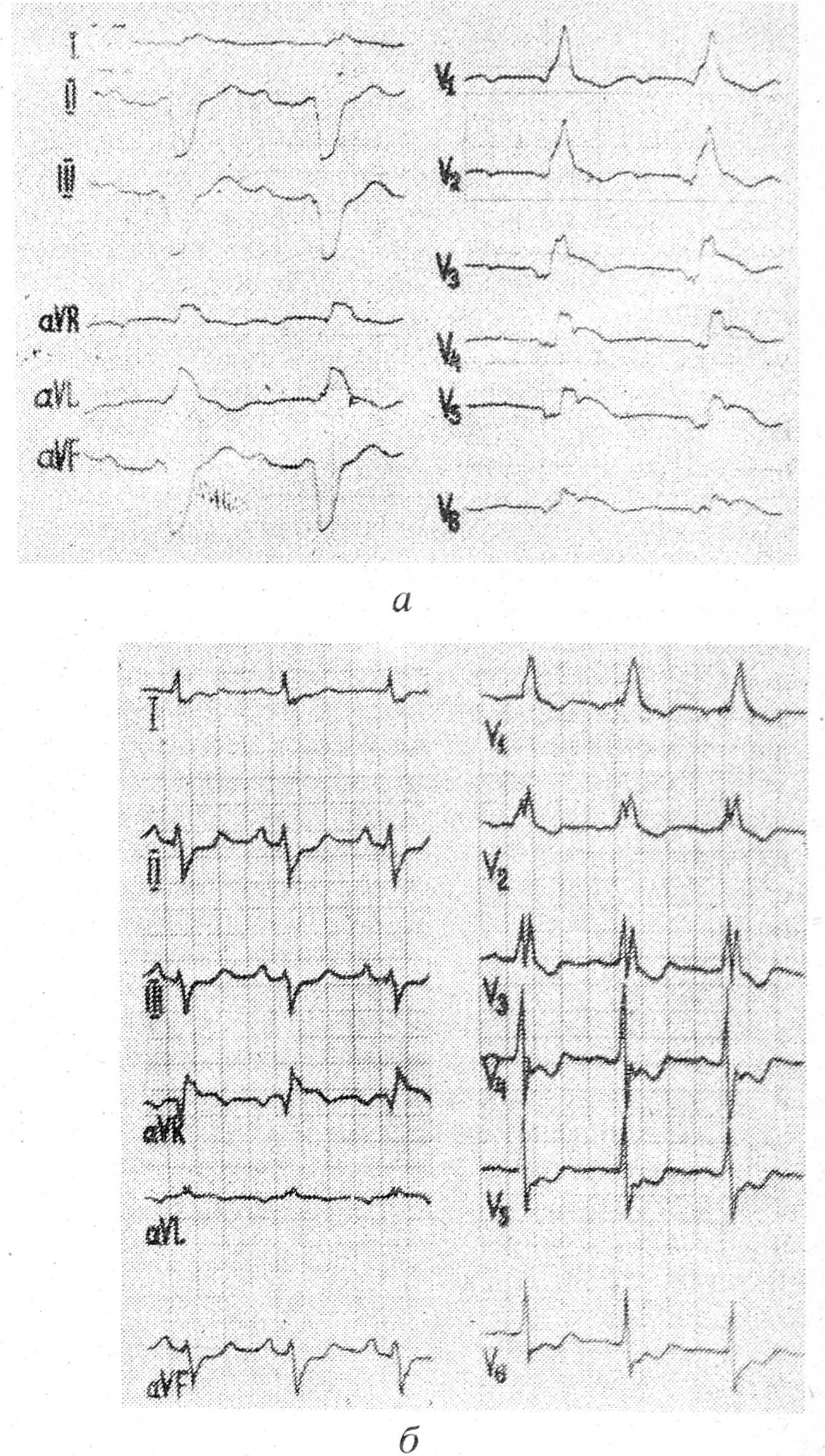 Рис. 3. ЭКГ больного М., 63 лет: а — исходная, б — через 9 ч от начала болевого приступа.