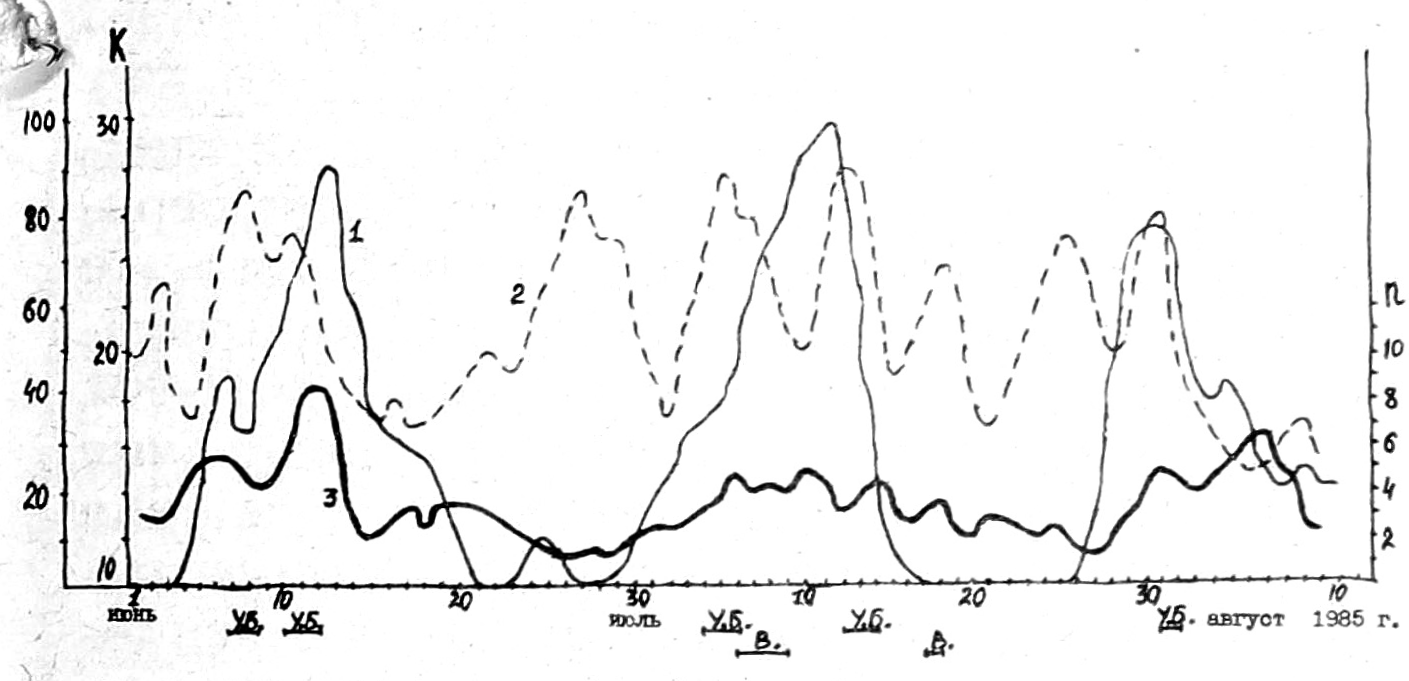Рис. 1. Динамика сердечно-сосудистых осложнений в зависимости от солнечной активности и напряженности магнитного поля Земли за июнь — август 1985 года. Обозначения: линия под цифрой «1» — числа Вульфа (w), «2»—индексы магнитной напряженности Земли (К), «3» — число случаев ухудшений состояния больных с сердечнососудистыми заболеваниями (n); У. Б.— умеренная буря, В.— возмущение магнитного поля Земли.