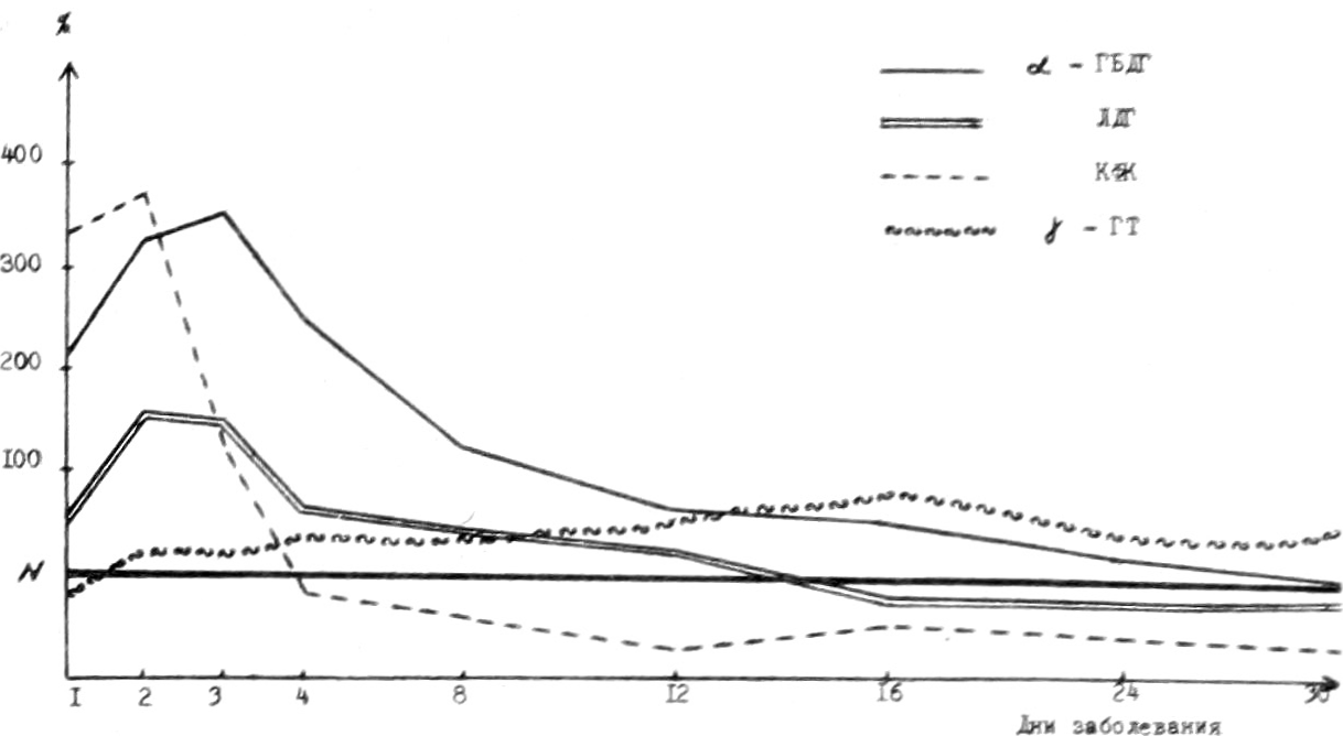 Рис. 1. Активность ферментов крови у больных крупноочаговым инфарктом миокарда в динамике заболевания (в % по отношению к нормальным показателям).