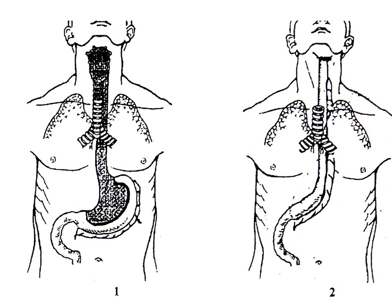 Схема тотальной ларингофарингоэзофагэктомии с одномоментной пластикой пищевода и глотки изоперистальтическим стеблем из большой кривизны желудка: 1 (выделенная область) — удаляемые ткани и органы; 2 — изоперистальтический стебель из большой кривизны желудка, проведенный в заднем средостении и подшитый к ротоглотке.