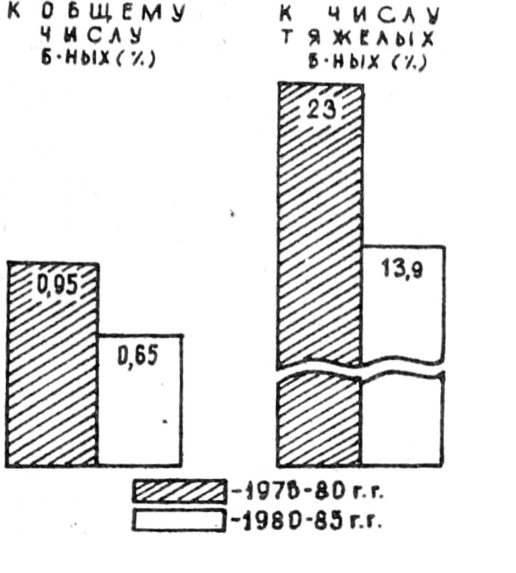 Рис. 1. Сравнительные показатели летальности при остром гепатите В в 1976— 1980 и 1981 — 1985 гг.
