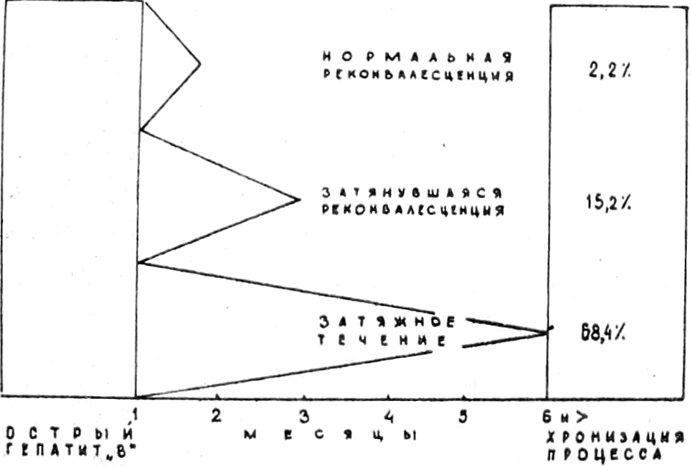Другим важным направлением проводившихся в нашей клинике исследований стала разработка критериев прогнозирования угрозы хронизации процесса. Первостепенная важность обозначенной задачи очевидна. Трудность ее решения определяется отсутствием зависимости угрозы хронизации от тяжести течения гепатита в острой фазе болезни. Было замечено, что после легких форм острого гепатита В хронизация процесса с формированием хронического персистирующего гепатита наступает не реже, а существенно чаще, чем после тяжелых. Правда, согласно нашим материалам, эта зависимость не распространяется на формирование хронического активного гепатита. Для прогнозирования угрозы хронизации процесса наиболее информативной оказалась детальная оценка течения восстановительного периода острого гепатита В (рис. 2).