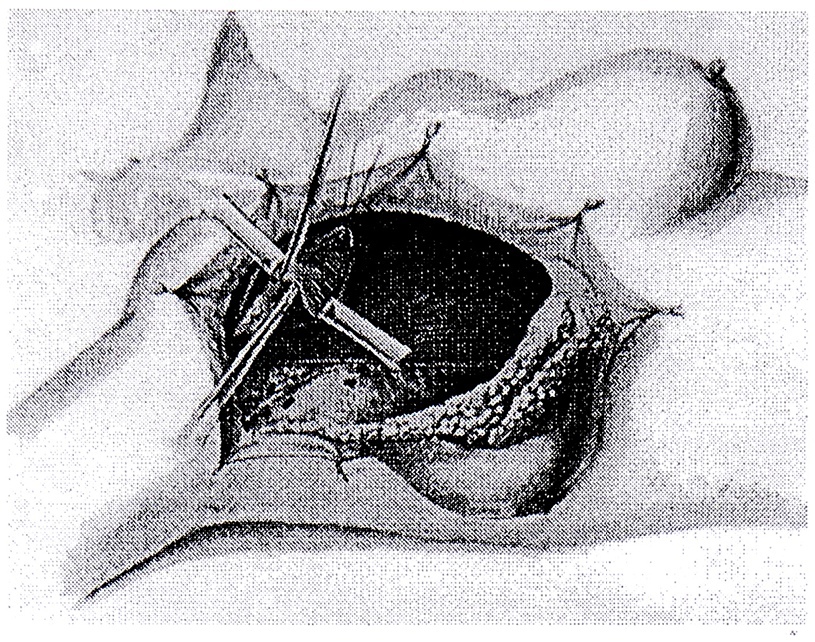 Рис. 1. Этап операции. Большая грудная мышца расщеплена вдоль волокон. R.r. pectoralis a.et v. thoraco-acromialis et n. thoraco-acromialis выделены и взяты на турникет. Пересекают малую грудную мышцу.