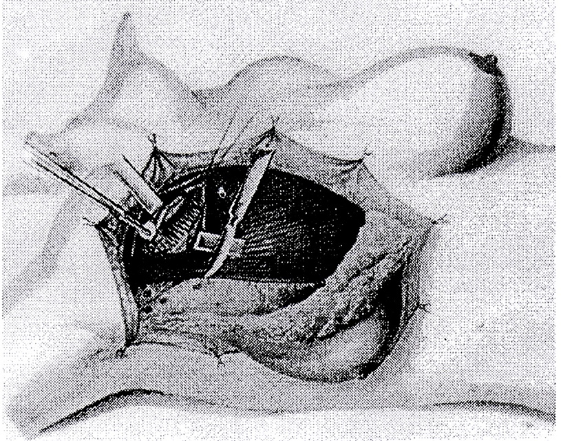D. Patey [10] описал модифицированную радикальную мастэктомию, основное отличие которой от всем известной радикальной мастэктомии по Холстеду заключалось в сохранении большой грудной мышцы. Давно известен факт, что кожа и подкожная клетчатка молочной железы обильно снабжены сетью лимфатических капилляров и сосудов, а в фасции большой грудной мышцы и в самих грудных мышцах лимфатические сосуды практически отсутствуют. На основании этого автор решил, что широкое иссечение кожи вокруг опухоли необходимо, а удаление большой грудной мышцы совершенно не нужно. Для полного удаления верхушечных и подключичных лимфатических узлов, автор считал вполне достаточным поднятие руки на стороне операции, смещение большой грудной мышцы к грудине и пересечение с последующим удалением малой грудной мышцы.