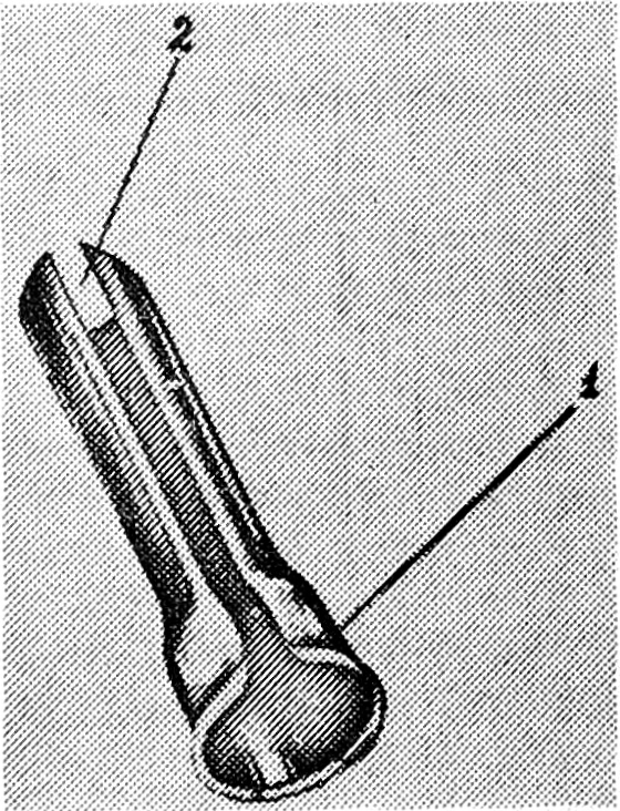 С целью исключения изложенных недостатков и атравматичного, быстрого проведения конца сухожилия под блоковидной связкой на пальцах нами предложен специальный проводник для сухожилий. Он выполнен из тонкостенной нержавеющей стали (см. рис.) в виде незамкнутой трубки с воронкообразным расширением (1) на одном конце и продольной щелью в стенке (2). Толщина стенки устройства — 0,6 мм, общая длина проводника — 18—20 мм, протяженность воронкообразного расширения — от 5 до 6 мм, ширина продольной щели — 3—4 мм. Диаметр проводника — в пределах 5—8 мм. В просвете блоковидной связки диаметр трубки сужается на 1—2 мм за счет эластичности ее стенки и благодаря наличию продольной щели (2). Изготавливается проводник различных типоразмеров. Применяется при операциях у взрослых и подростков в возрасте от 14 до 15 лет. У детей младшего возраста мы проводили конец сухожилия под блоковидной связкой другим способом.