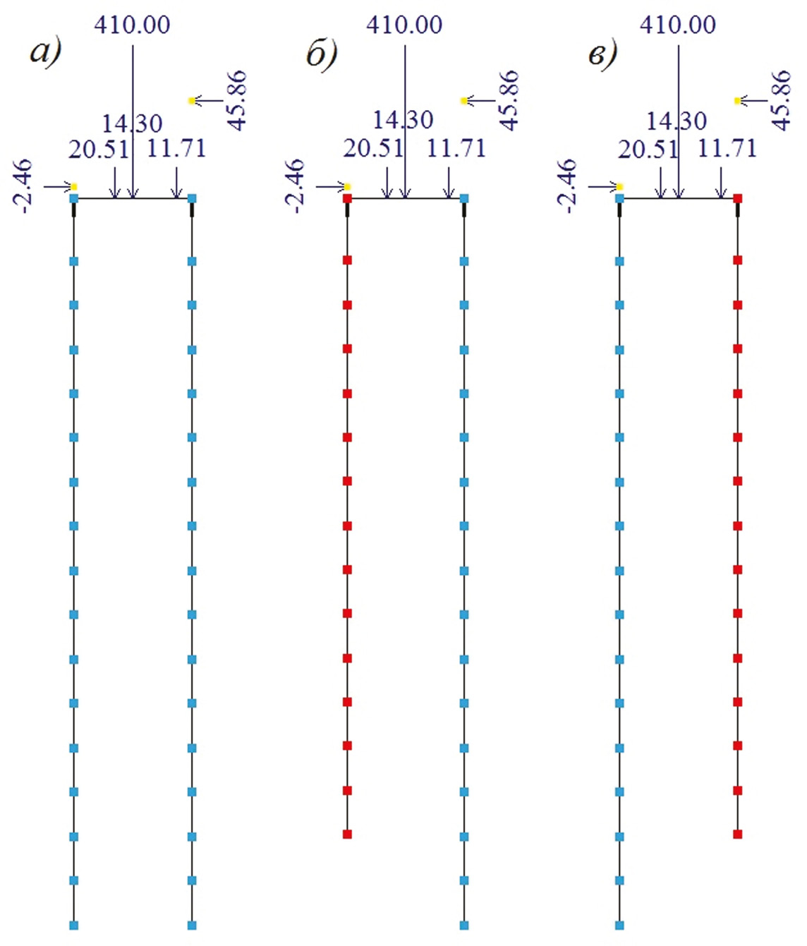 Рис. 1. Численные модели ленточного внецентренно нагруженного свайного фундамента: а) ростверк с одинаковой длиной свай; б) ростверк с разной длиной свай (короткая свая воспринимает вдавливающую нагрузку); в) ростверк с разной длиной свай (короткая свая воспринимает выдергивающую нагрузку)
