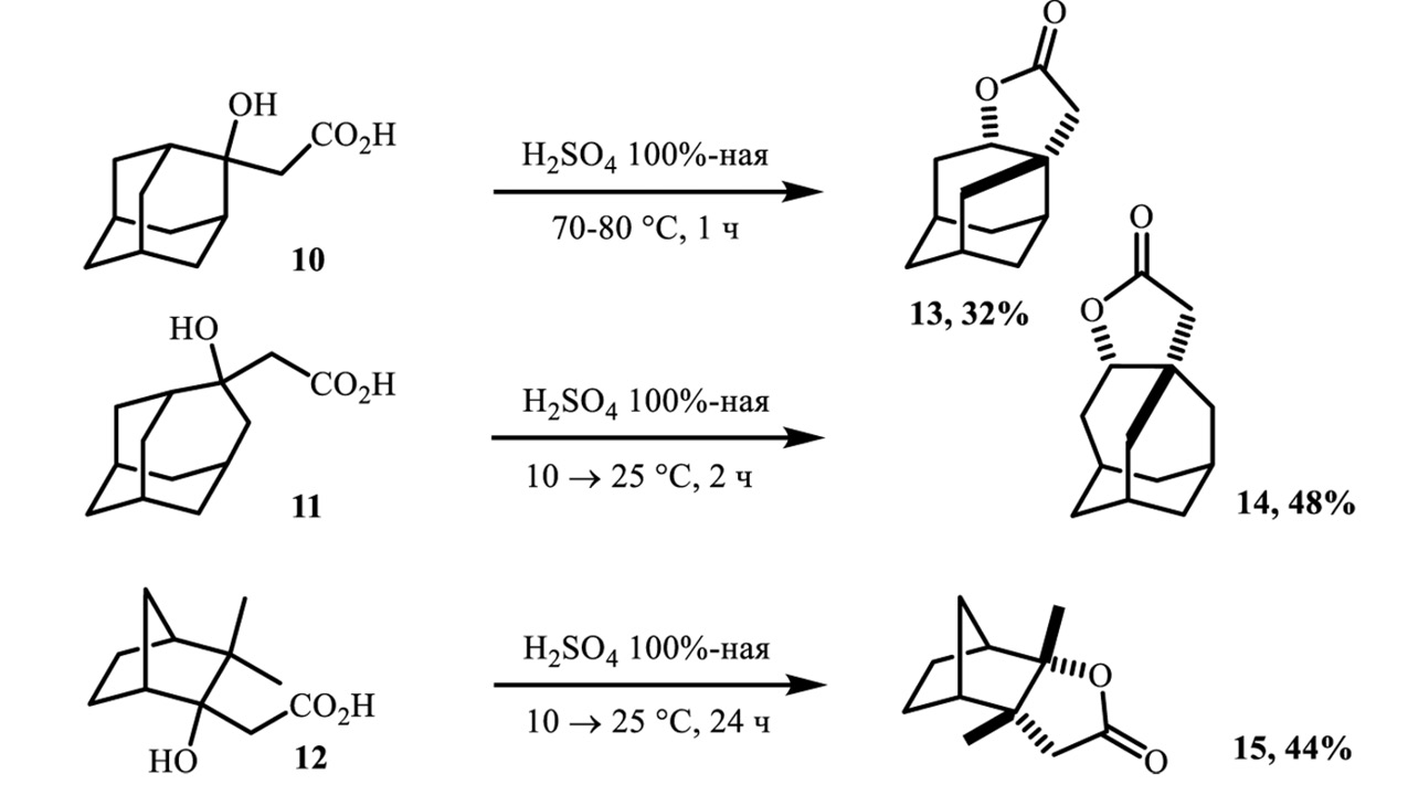 Следующий этап работы заключался в изучении скелетных перегруппировок би- и трициклических производных, на примере субстратов адамантанового ряда и его гомолога. В условиях реакции Реформатского были получены β-гидроксикислоты, которые далее обрабатывали концентрированной серной кислотой. При взаимодействии соединений 10, 11 и 12 со 100 % H2SO4 были получены продукты перегруппировки 13, 14 и 15 соответственно (рис. 2).