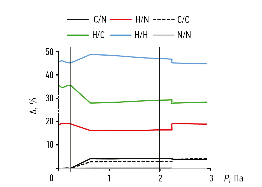 Из графика видно, что наибольший вклад привносят контакты H/#H. Судя по всему, это связано со спецификой структуры молекулы, в которой остальные атомы частично экранированы атомами водорода, что мешает им в полной мере участвовать в межмолекулярных контактах. При увеличении давления уменьшается вклад межмолекулярных контактов H/#H и увеличивается вклад контактов H/C, что связано с приближением отдельных молекул «торец к плоскости», или же π-стекинг взаимодействие, из-за чего атомы водорода одной молекулы становятся более экранированными атомами углерода и азота другой молекулы. Далее при переходе в другую пространственную группу вклад межмолекулярных контактов H/#H увеличивается, так как молекулы укладываются «стопкой» и межмолекулярные расстояния между водородами соседних молекул уменьшаются. В пр. гр. Pbca плоскости соседних молекул расположены уже под некоторым углом (не параллельно), за счет чего вклад контактов H/#H уменьшается.