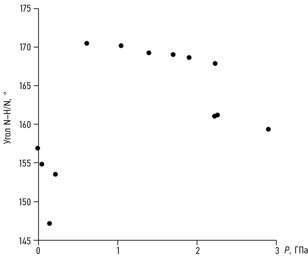Также была выявлена зависимость изменения угла N···H–N в упрощенных структурах бензимидазола, которая наглядно иллюстрирует характер изменения упаковки молекул от величины внешнего давления (рис. 3).