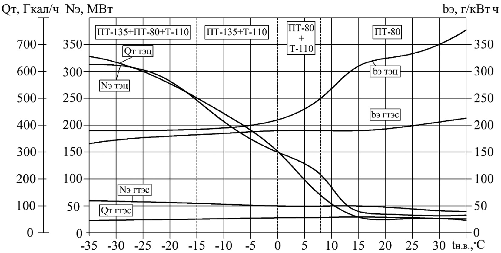 Рис. 3. Результаты расчета изменения электрической Nэ и тепловой Qт мощностей, удельного расхода условного топлива bэ в зависимости от температуры наружного воздуха для ГТЭС и ТЭЦ
