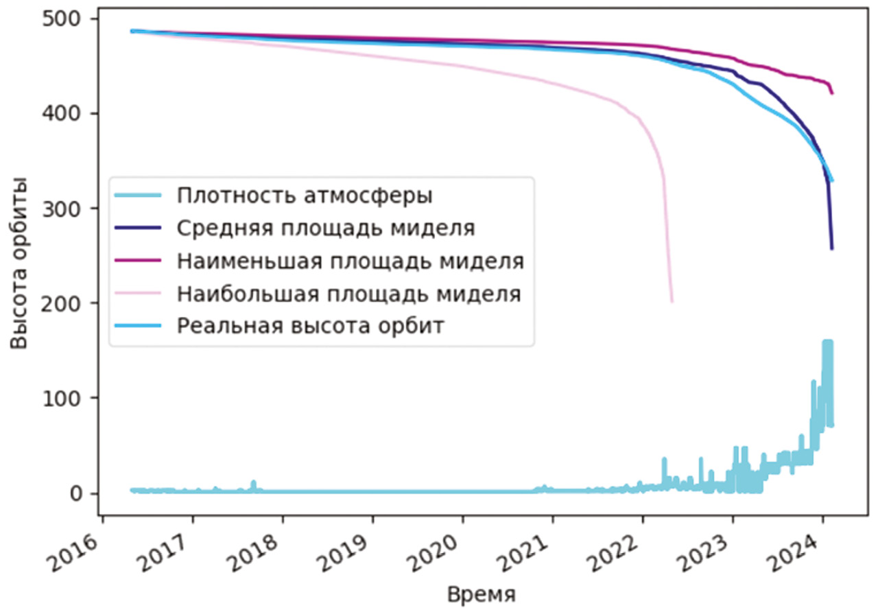 Проведя моделирование по методике ГОСТ-Р 25645.166–2004 [3], были получены зависимости высоты орбиты МКА «АИСТ-2Д» для трех вариантов ориентации, изображенных на рис. 3.