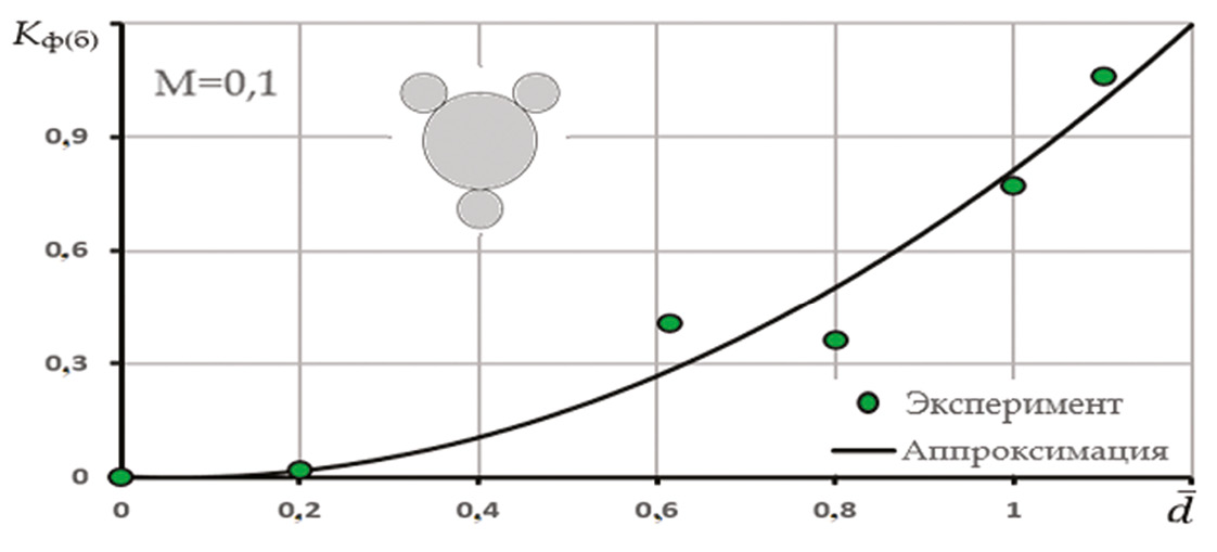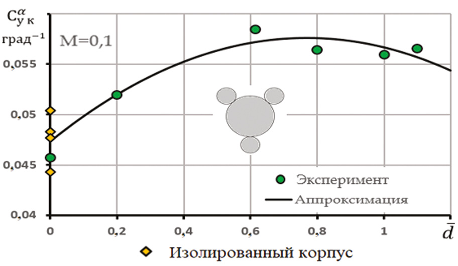 Результаты. На рис. 1 представлена зависимость производной коэффициента нормальной силы по углу атаки от относительного диаметра ВБ. Данная зависимость хорошо аппроксимируется с относительным среднеквадратичным отклонением (СКО) σ ≈ 1,1 % полиномом второй степени