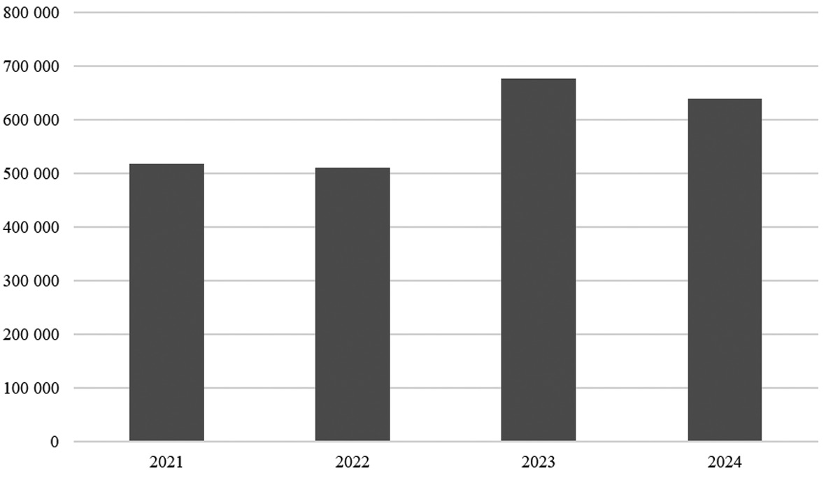 Рис. 1. Количество киберпреступлений в России (2021–2024)